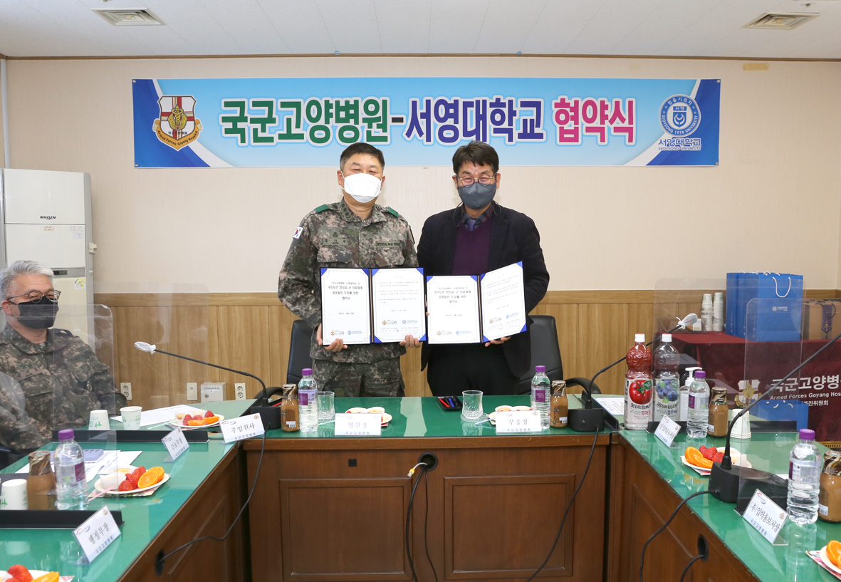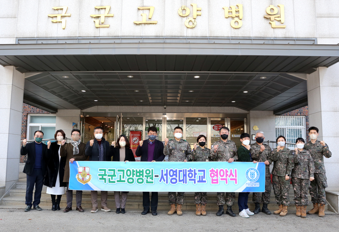 지난 12월 28일, 우리대학 (총장 김정수)은 국군고양병원 (병원장 홍기태)과 장병 및 국민보건향상과 연구 및 교육의 상호 협력, 선진 군 의료체계 공동발전을 위해  상호 업무협약을 체결하였다. 협약식은 국군고양병원 회의실에서 진행 되었으며, 김순곤 서영대학교 부총장, 장동민 입학홍보처장, 장철인 학생취업처장, 이명선 치위생과 학과장, 이지웅 임상병리과 학과장, 홍보경 보건의료행정과 학과장, 서권홍 홍보기획팀장 등 서영대학교 관계자와 홍기태 병원장, 이인섭 인행과장, 군의관 등 국군고양병원 관계자 등 20여 명이 참석하였다.