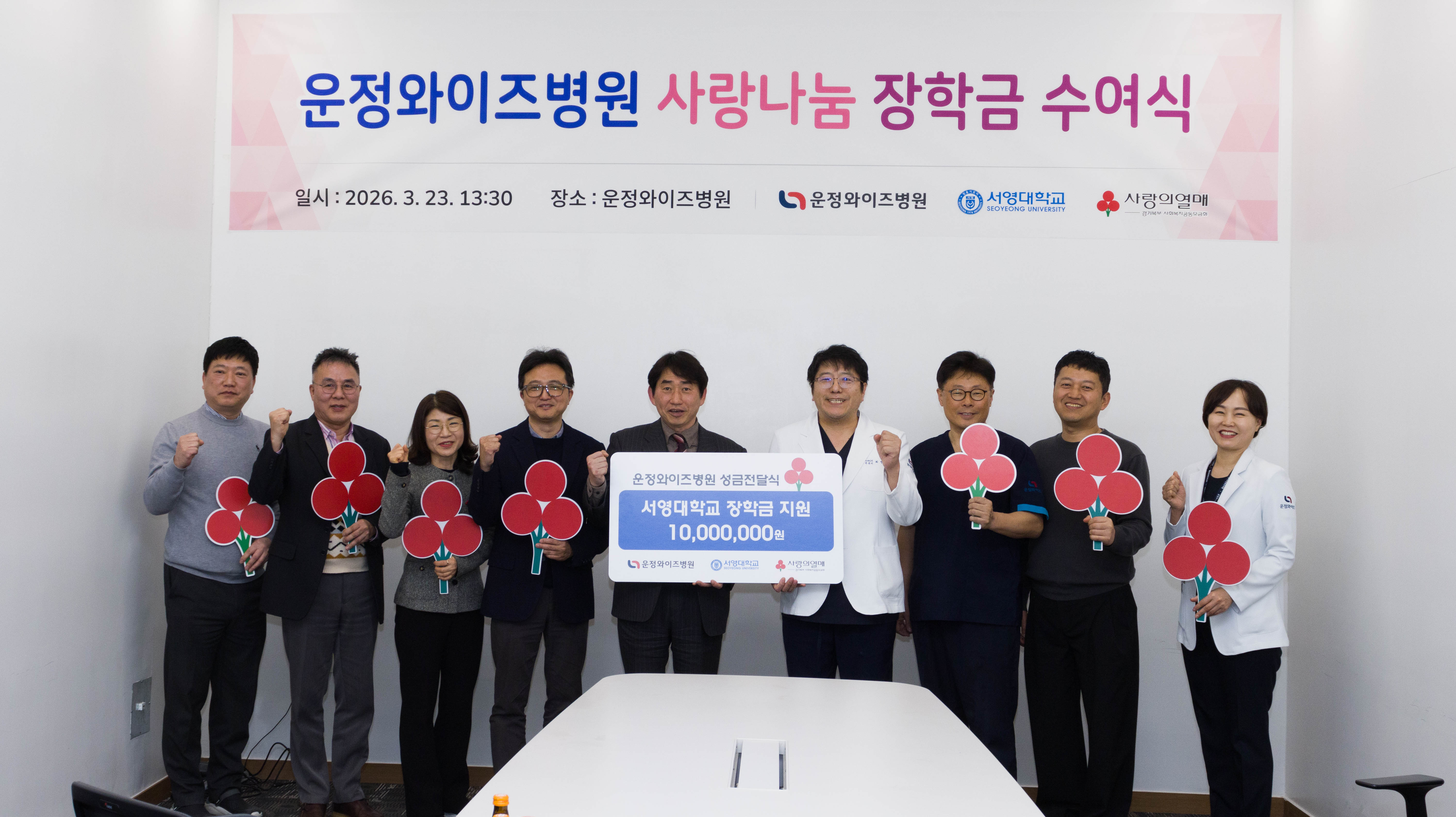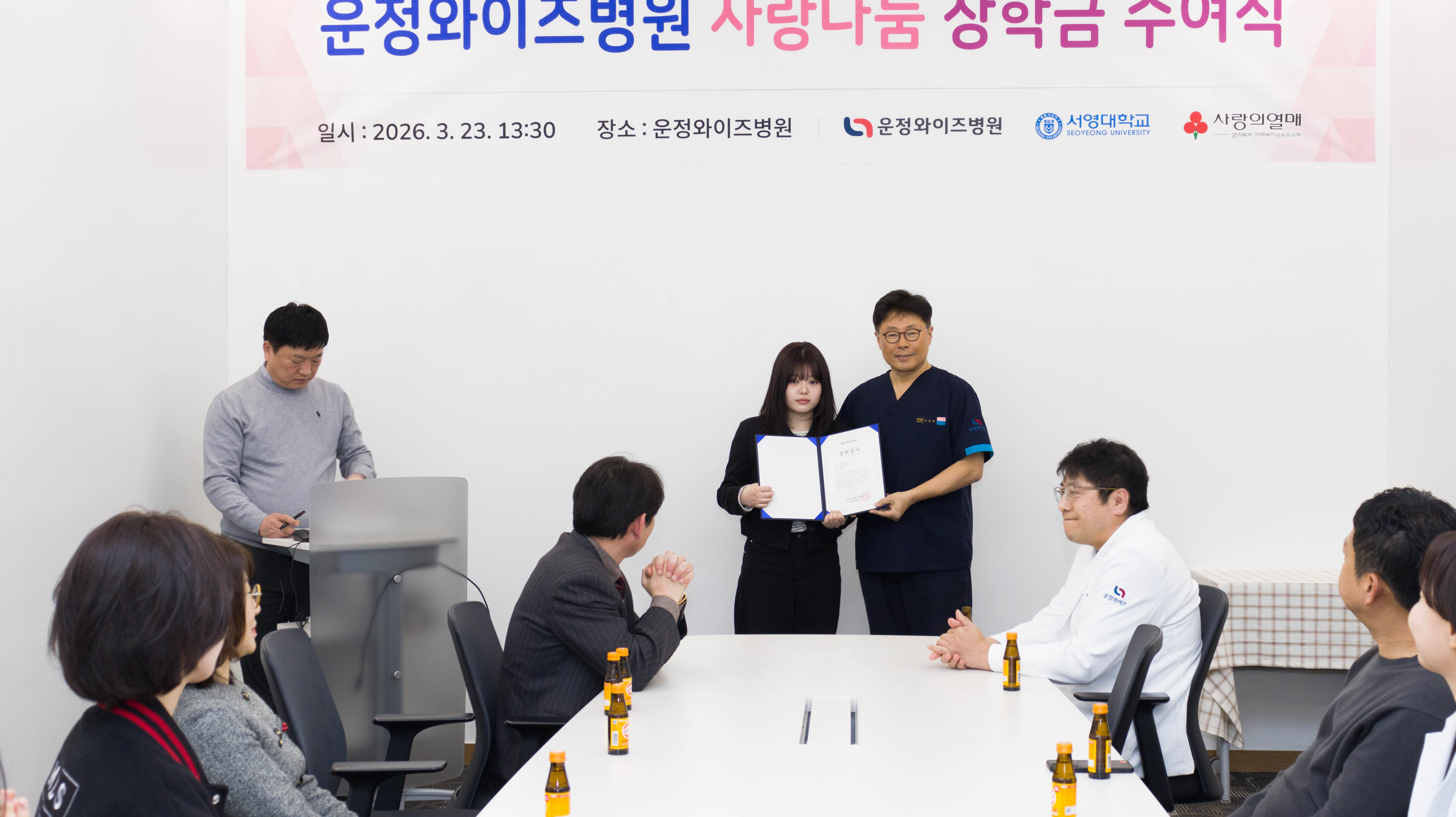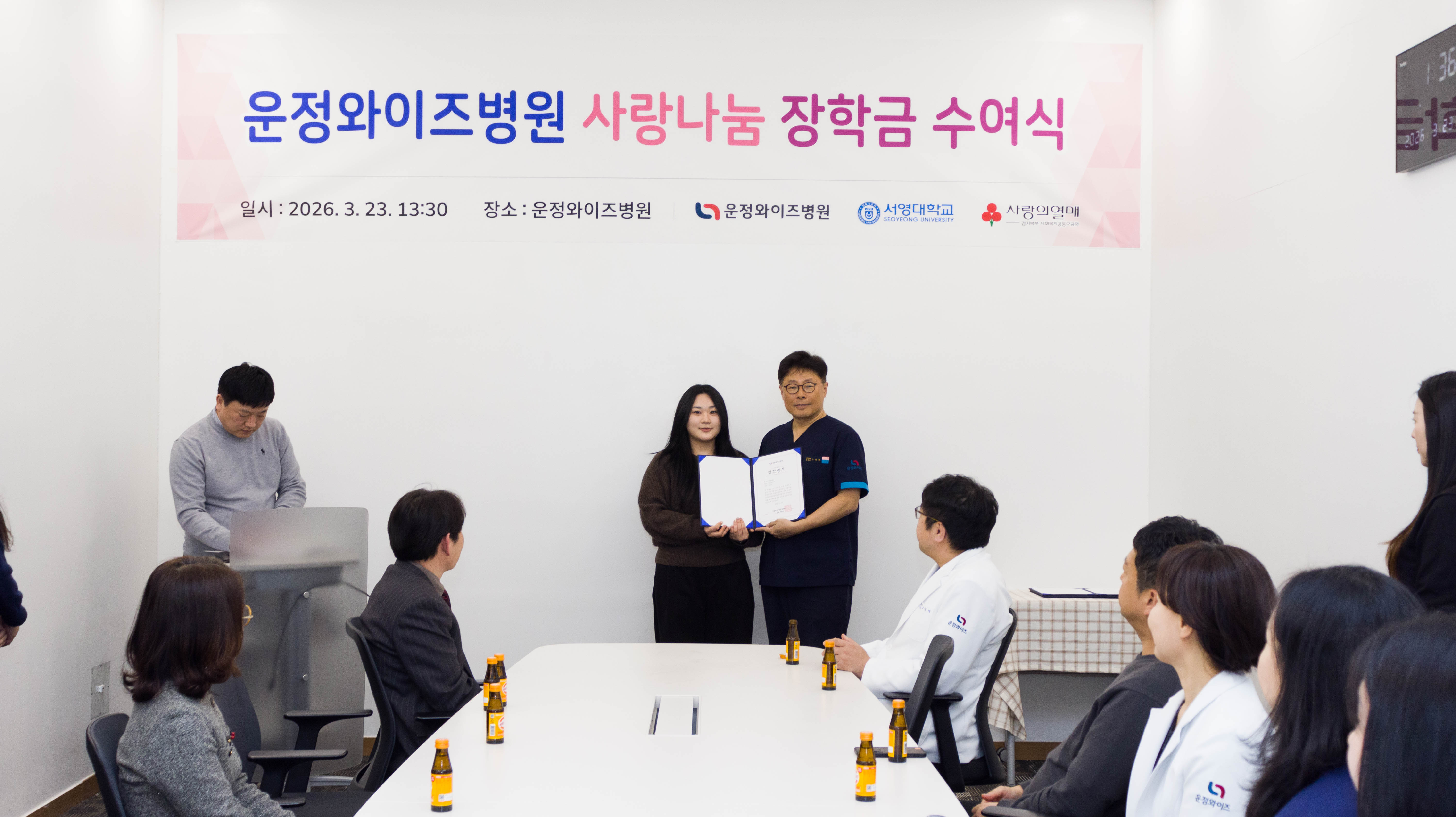 이번 수여식은 ‘운정와이즈병원–서영대학교–사랑의열매가 함께하는 나눔의 의미를 담아 마련된 자리로, 학업에 성실히 임하고 타의 모범을 보인 학생들을 격려하고 미래 의료인으로서의 성장을 응원하기 위해 진행되었다.