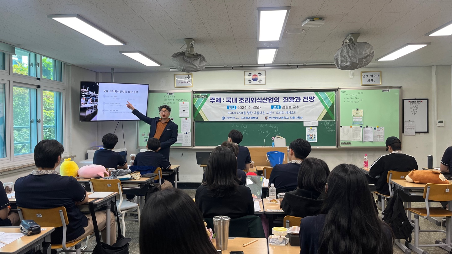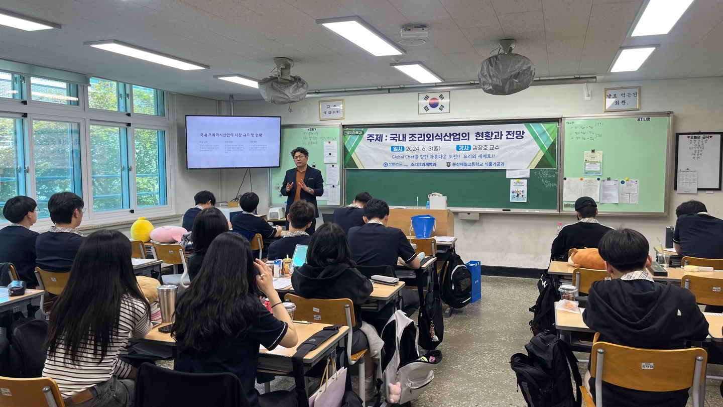 O. 우리대학(총장 김정수) 조리제과제빵과는 6월 3일(월) 문산제일고등학교 식품가공과에 방문하여 3학년 재학생 30명을 대상으로 재능기부 진로체험특강을 실시하였다. 진로체험특강은 “국내 조리외식산업의 현황과 전망”이라는 주제로 조리제과제빵과의 김장호 교수가 특강을 진행하였다.