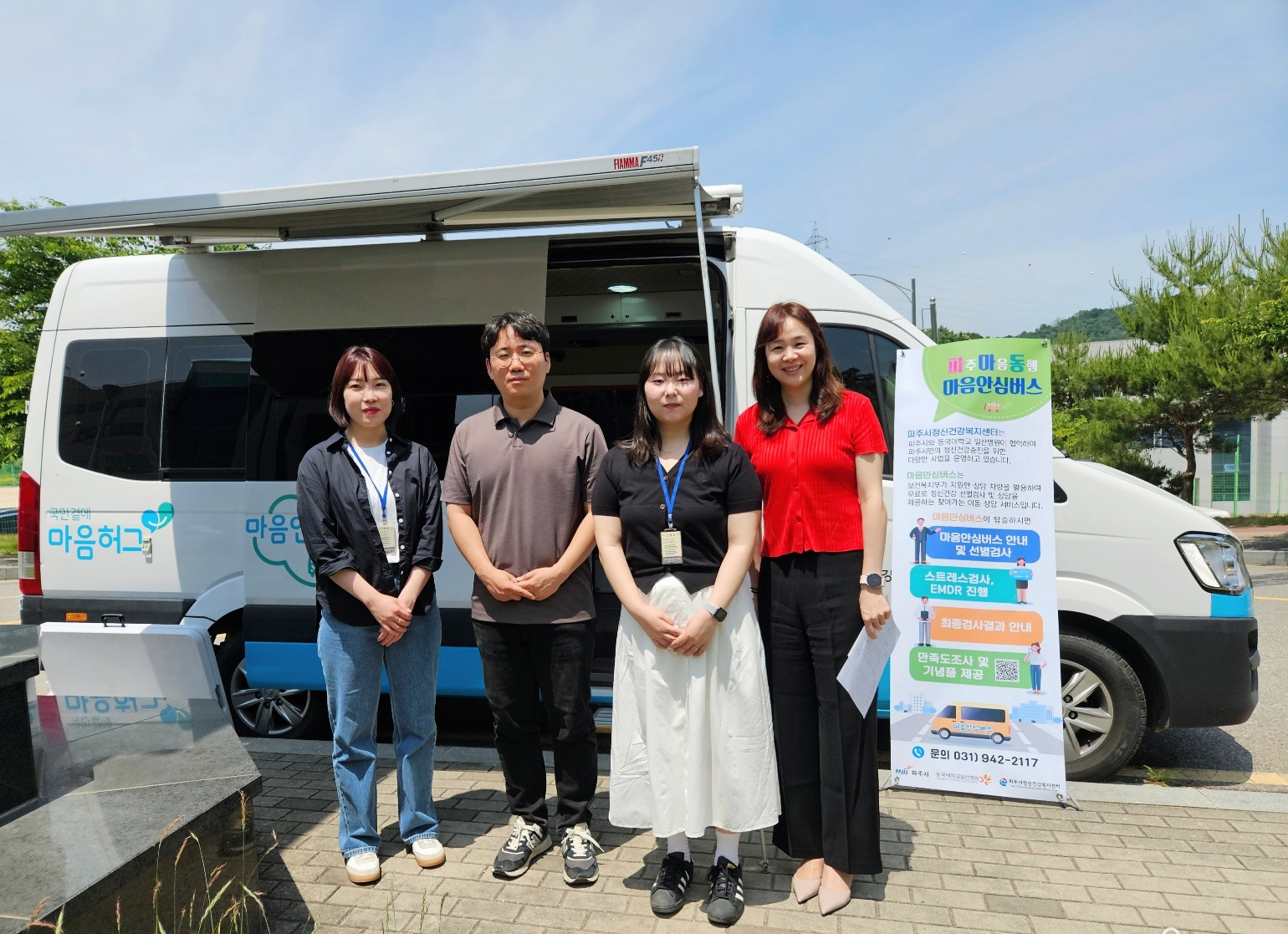 O. 우리대학(총장 김정수) 인권상담센터(부센터장 오민정)은 파주시정신건강복지센터와 업무협의를 통해 청년 정신건강증진을 위한 2030 파주마음동행 마음안심버스 사업을 진행하였다. 6월 5일 진행된 2030 파주마음동행 마음안심버스 사업은 오민정 인권상담센터 부센터장, 최희수 사회복지사, 박슬기 사회복지사, 김서윤 사회복지사가 함께 진행하였다.