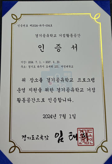 O. 우리대학(총장 김정수)과 파주교육지원청(교육장 최은미)은 상호 존중과 신뢰를 바탕으로 경기공유학교 거점활동공간 사용을 합의하였다. 이번 합의와 함께 우리대학은 경기공유학교 프로그램의 안정적 학습 지원을 위한 경기공유학교 거점 활동공간으로 인증(기간 : 2024.07.01 ~ 2027.06.30.)을 받았다.